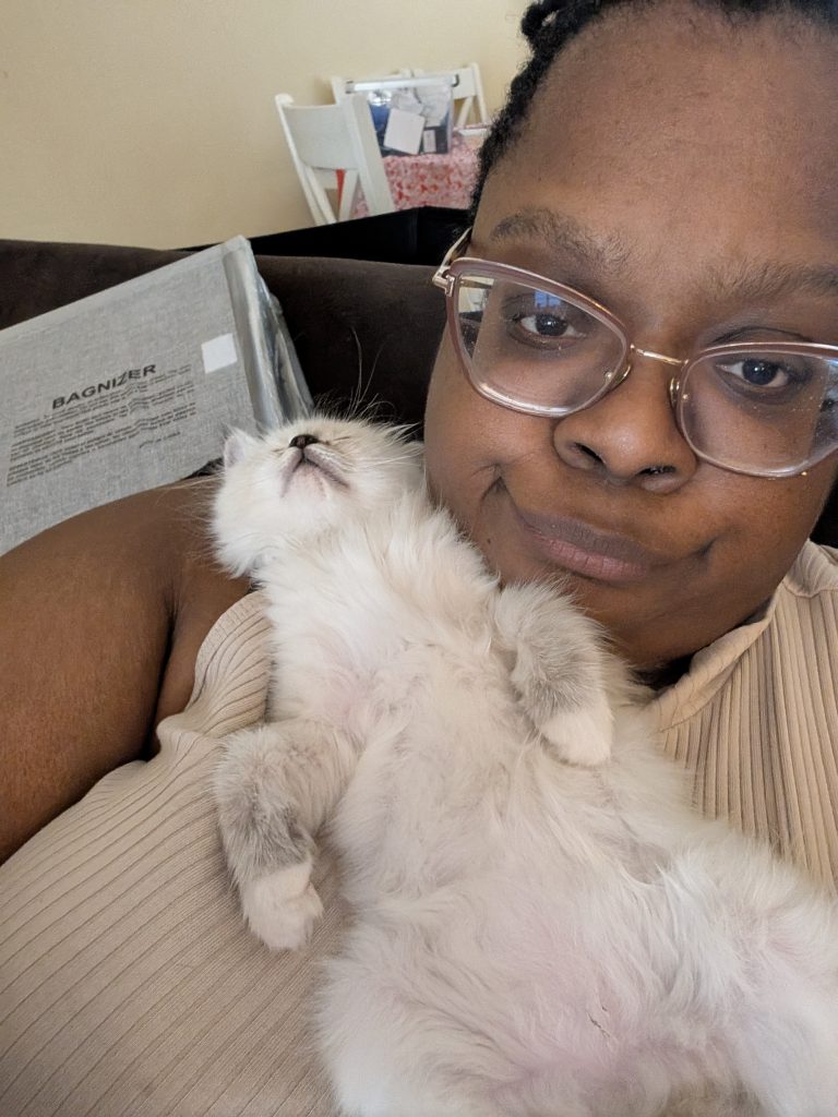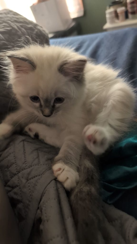 She’s acclimated to our home and is feisty as the day is long. I wear mostly dresses in the summer and she attacks the skirts as they walk past her. Lula’s favorite place to sleep is on my chest as you see above. This is a nightly thing. If you follow me on Tiktok, you can see quite a few videos of her asleep.
